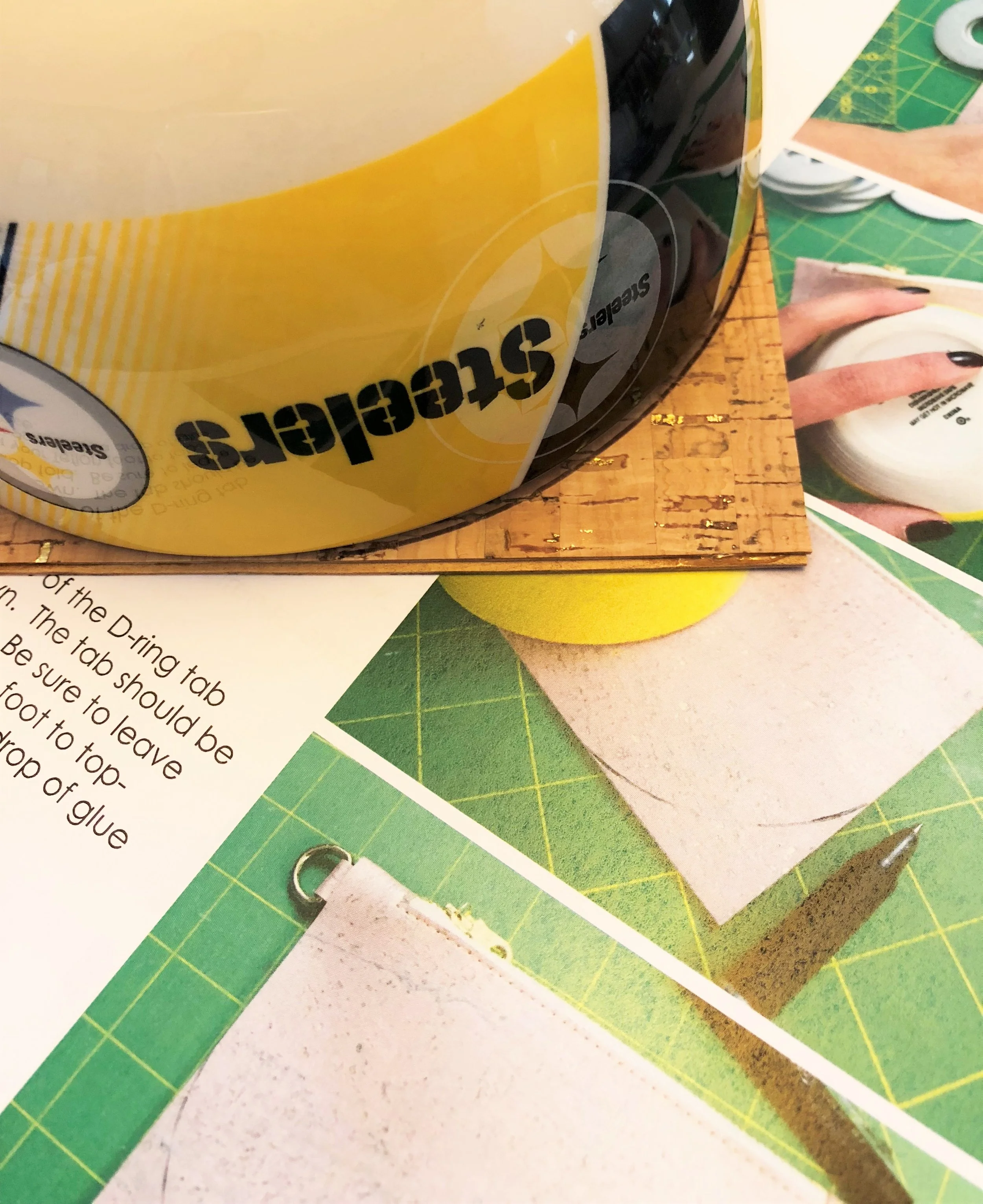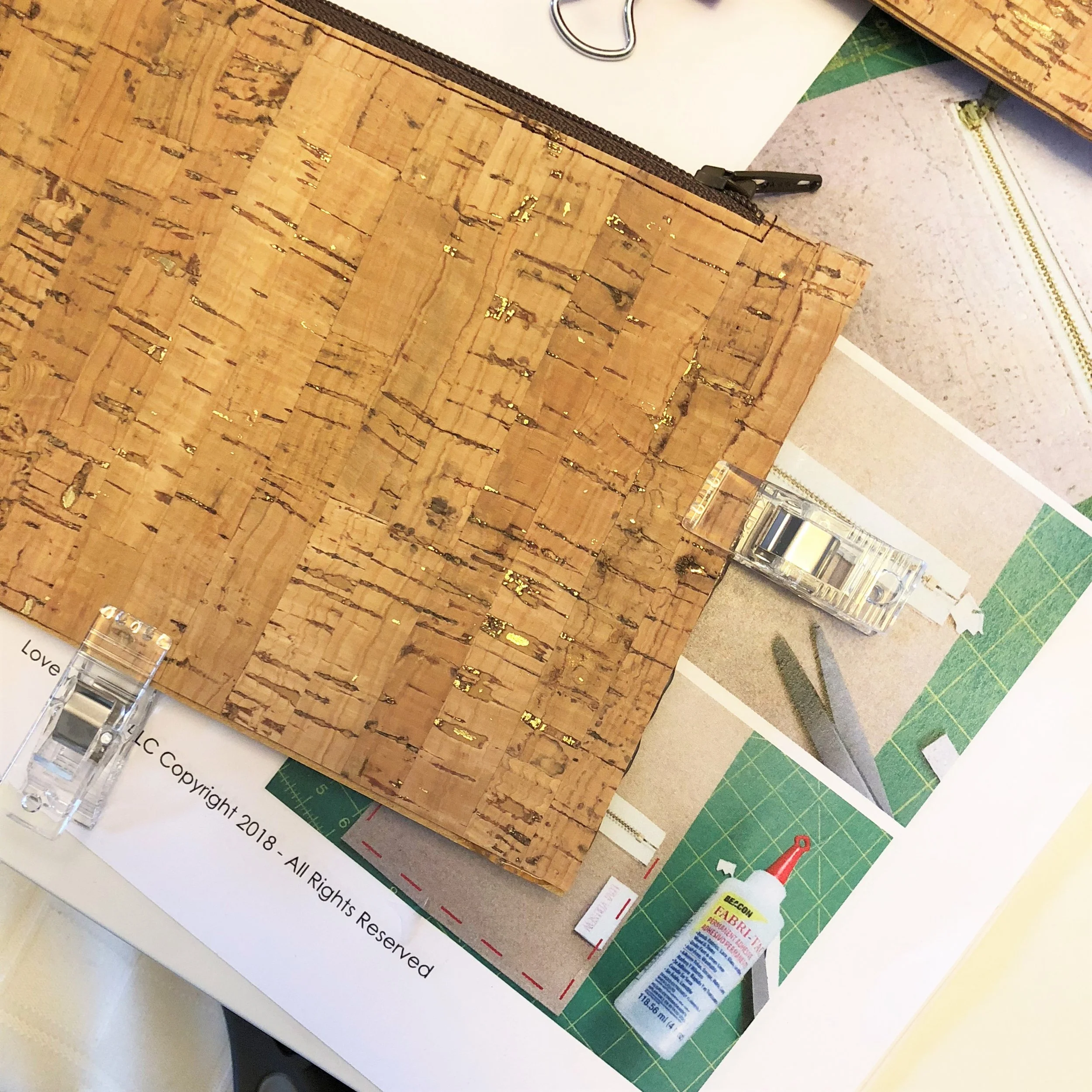 My third “never have I ever” for this project was using these fun little clips. I have always been a pin girl. So much of a pin girl, in fact, that I do not own a pin cushion but instead a pin cup! Yep, I use an old one cup measuring cup to hold all of my pins. Because you can’t use pins on cork (or leathers and suedes), I used these clips in conjunction with some fabric glue to keep everything together while I drew my curves.